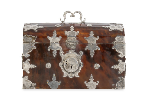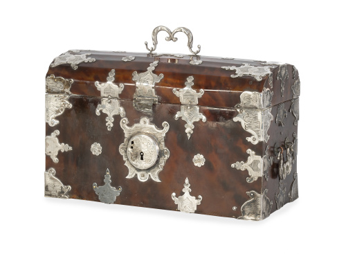 Cofre de carey con tapa de bóveda de medio cañón, montado en plata grabada y recortado.