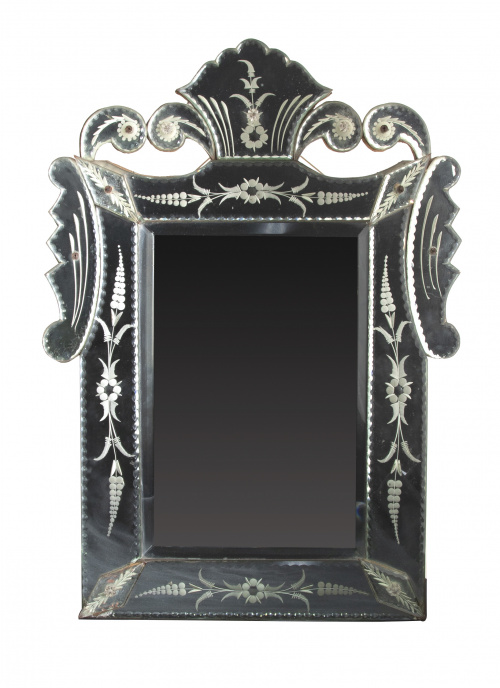 Home / SUBASTA JUNIO 2023 / Espejo de cristal grabado al ácido y flores aplicas.Muran
