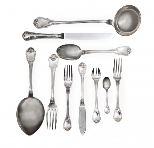 Formada por: 12 cucharas de sopa, 12 tenedores de carne, 12 cuhillos de carne, 12 tenedores de pescado, 12 palas de pescado, 12 cubiertos para marisco, 12 cucharas de postre, 12 tenedores de postre, 12 cuchillos de postre, 12 cucharitas de moka, 12 cucharas de helado, 9 cubiertos de servir.