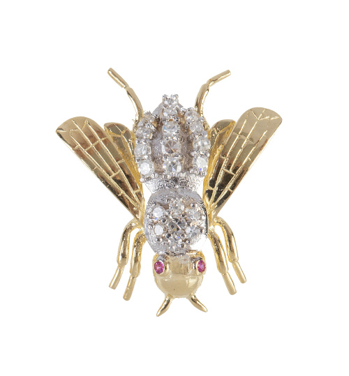 Conjunto de dos broches con diseño de mosca años 50, con cuerpo de brillantes y ojos de rubíes, con decoración grabada