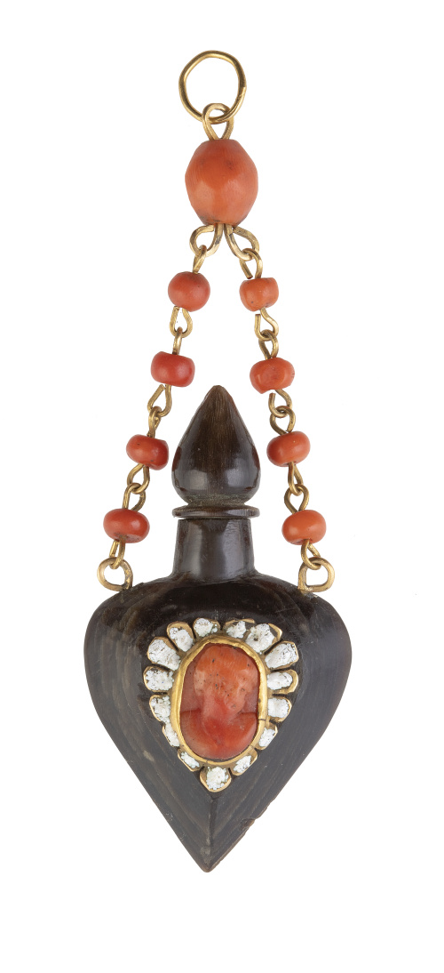 Botellita perfumero S. XVII , posiblemente Trapani, realizado en asta, con camafeo de coral rodeado de pétalos de esmalte blanco en anverso y corazón en reverso