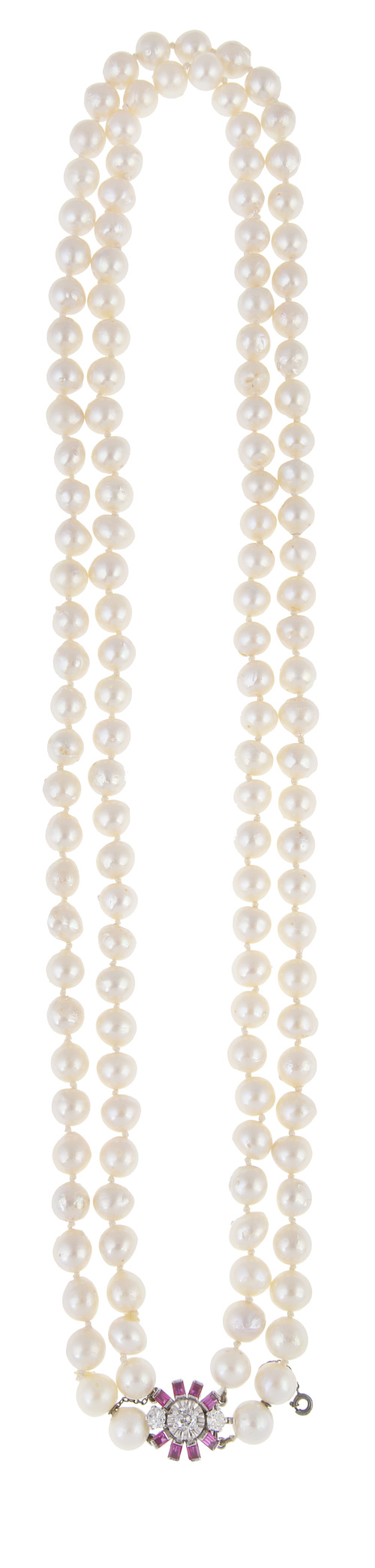 309. Collar largo años 40 de dos hilos de perlas con cierre circular de brillantes y rubíes carré en forma de flor