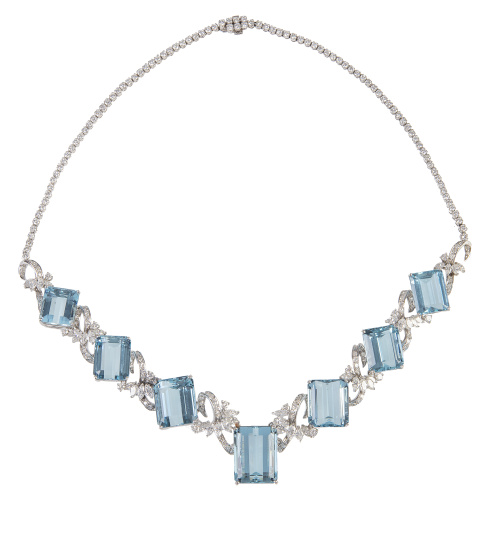 Collar de aguamarinas y brillantes, con siete aguamarinas talla esmeralda de intenso color unidas por lazos de brillantes y diamantes talla navettes