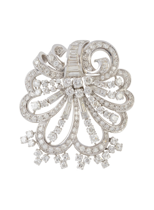 387. Elegante broche-colgante con diseño de flor años 50, de brillantes combinados con diamantes talla baguette y trapecio