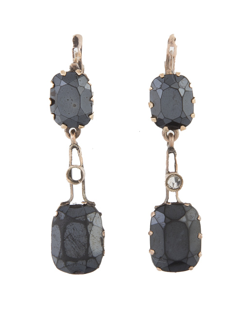 Pendientes largos de pp. S. XX con dos azabaches de talla rectangular y zafiros blancos