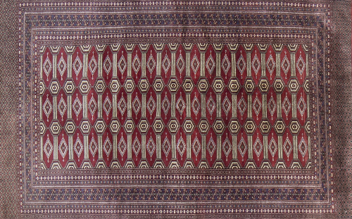 572. Alfombra en seda de campo granate, con decoración geométrica.