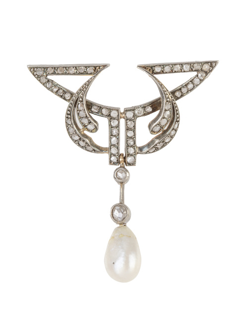 Home / SUBASTA OCTUBRE 2023 / Broche de ff. S. XIX con diamantes y perilla de perla colga