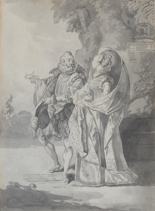 Paret se adentra en este topos para crear una representación de aire teatral, cortés y pomposa, sirviéndose de la gestualidad y la indumentaria como formas de expresión del contenido, algo que ya había ensayado previamente en su Ensayo de una comedia (óleo sobre lienzo, 38 x 51, conservado en el Museo Nacional del Prado con número de inventario P02991), en cuyo margen izquierdo escenifica este mismo asunto con idénticos protagonistas.