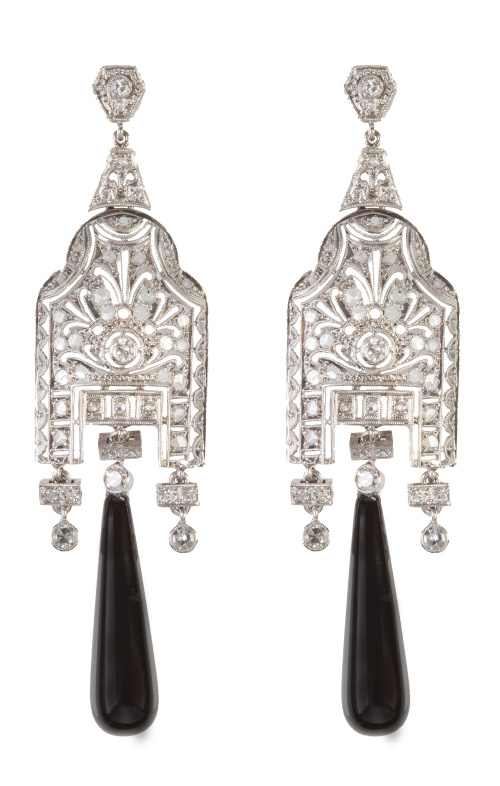 168. Pendientes largos con cuerpo calado de brillantes del que pende perilla de ónix