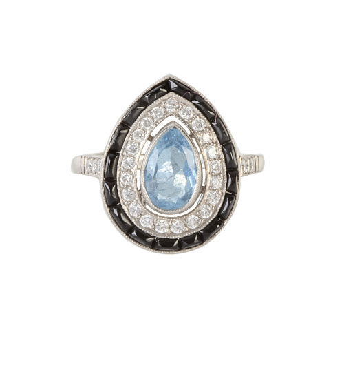 Sortija diseño gota con aguamarina central talla pera, con marco de brillantes y otra exterior de zafiros