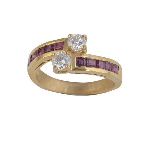278. Sortija tu y yo de brillantes y rubíes relizada con rubíes calibrados en los brazos de la montura, que rematan en brillantes