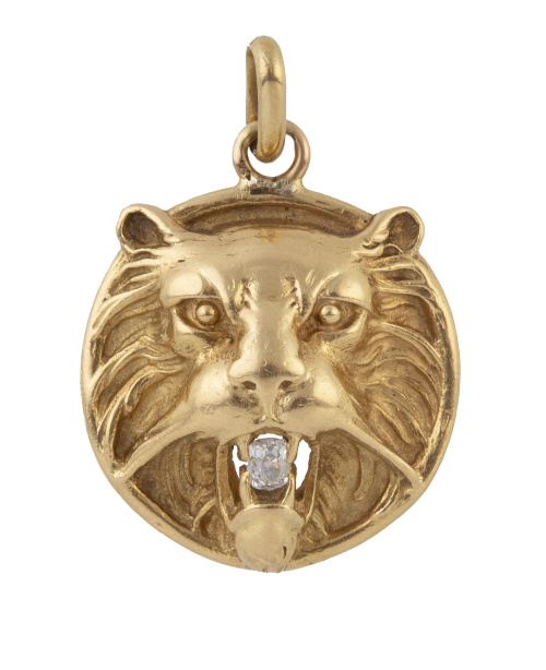 Colgante de pp. S. XX con cabeza de león que sostiene brillante oval de talla antigua en la boca