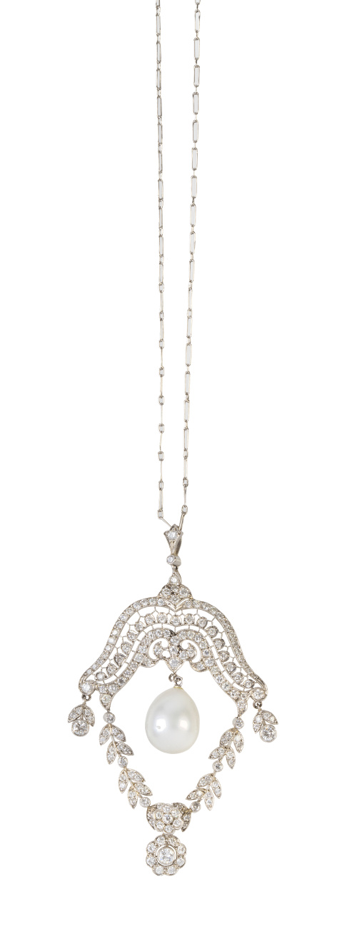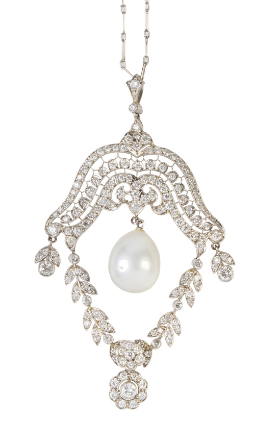 Pendentif de brillantes estilo Belle-Époque con gran perilla de perla colgante en el interior