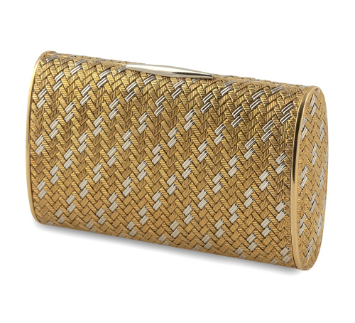 Monedero-pitillera en malla de oro bicolor con decoración de tejido trenzado, en volumen con sección lateral ovalada
