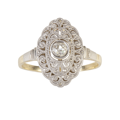 Sortija Art-Decó de frente oval con brillante central y decoración calada