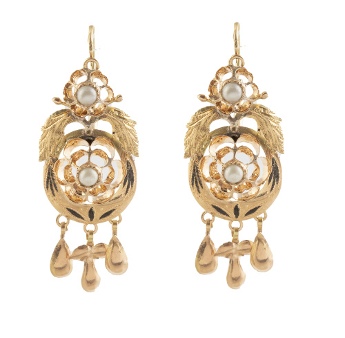 Pendientes largos con aro calado decorado con flores y hojas adornados con perlitas