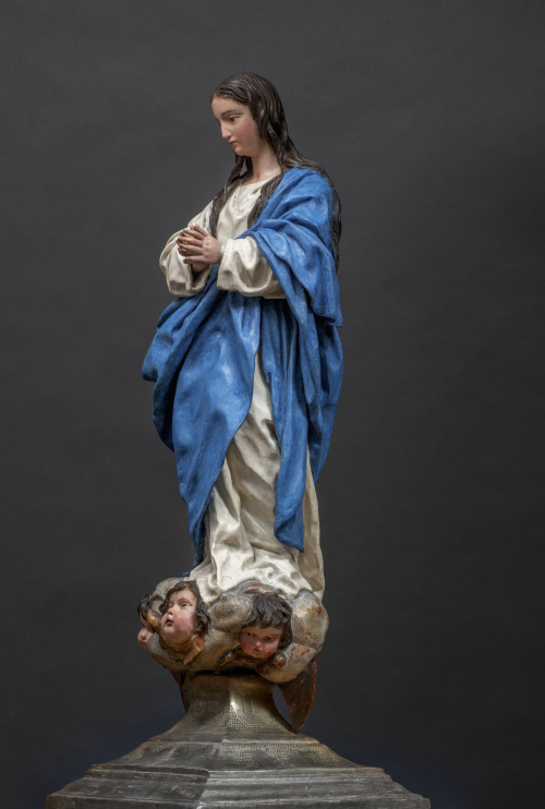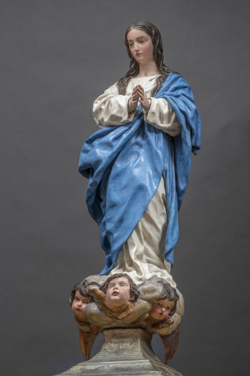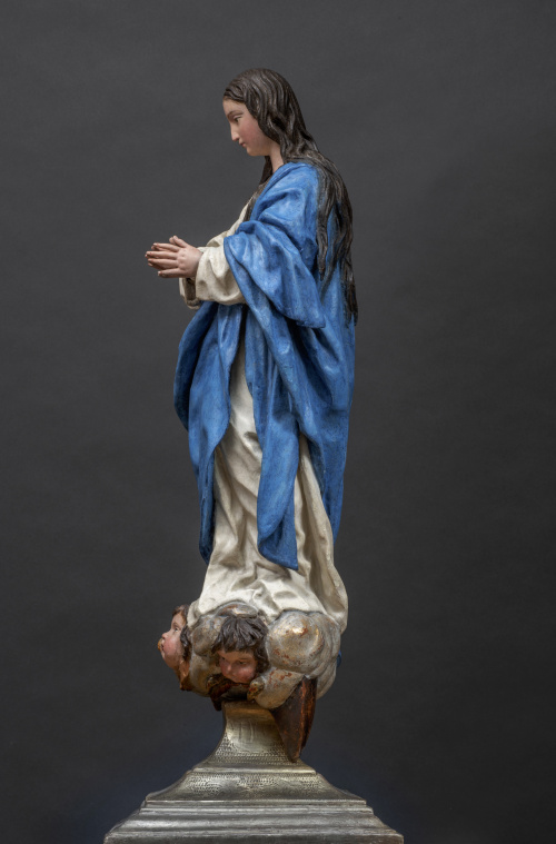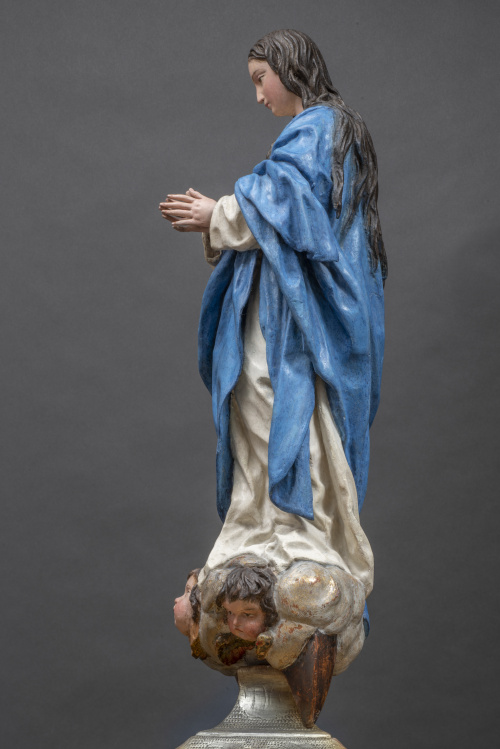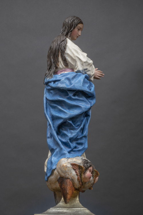 Vuelto a su ciudad natal en 1652, Alonso Cano depura su técnica y desarrolla una serie de esculturas de pequeño formato en las que prima la organicidad a partir del juego de planos cóncavos y convexos. Con ello parece trasladar a la madera la blandura del barro, tal como evidencia esta obra que aquí estudiamos, cuidadosamente tallada también en su reverso. Con la Inmaculada del Facistol, esa obra comparte el modelo de rostro adolescente que no pretende ser un reflejo del natural sino una idealización neoplatónica de la belleza femenina. En contraposición a la serenidad y contención del rostro mariano, la talla del manto azul es volátil y cuelga de un hombro, con profundos y menudos pliegues curvos que dotan al manto de una ductilidad excepcional. La túnica blanca, en contraste con el manto azul, cae sobre el cuerpo de la Virgen, fundiéndose con el cúmulo de nubes que conforma la base, de la cual emergen tres querubines alados sobre una media luna invertida.