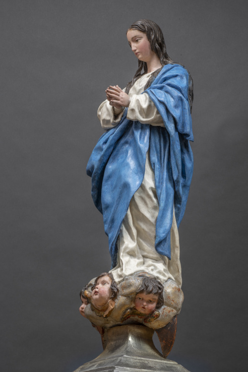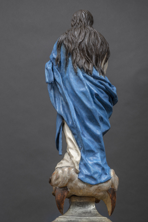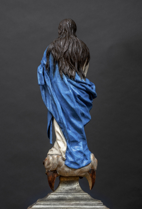 La Inmaculada que subastamos, realizada en madera de cedro y de 0.54 m de altura, se puede comparar con la obra citada debido a su similitud plástica y a sus dimensiones. Un estudio detallado de la obra permite advertir que, en su fuerte plasticidad, no copia exactamente los volúmenes y plegados de la obra original, sino que muestra ligeras variantes igualmente patentes en la expresión del rostro.