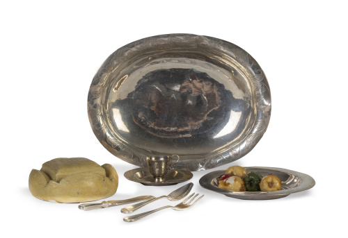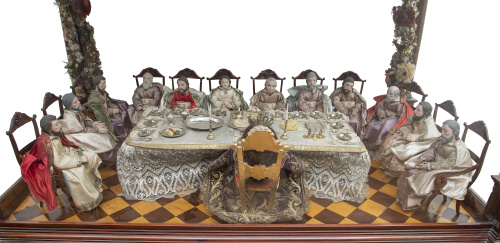 Las figuras dispuestas en la mesa sentadas en sillas de madera tallada, la silla de Jesús es de madera tallada y dorada. La mesa cubierta por un mantel rematado por encaje. Los cubiertos (tenedor, cuchara y tenedor) y las tazas son de plata, también hay elementos como un corparal, cáliz, vinajeras, una bandeja con un cordero, frutas de madera policromada, una hogaza de pan y candeleros, entre otras piezas.