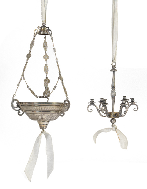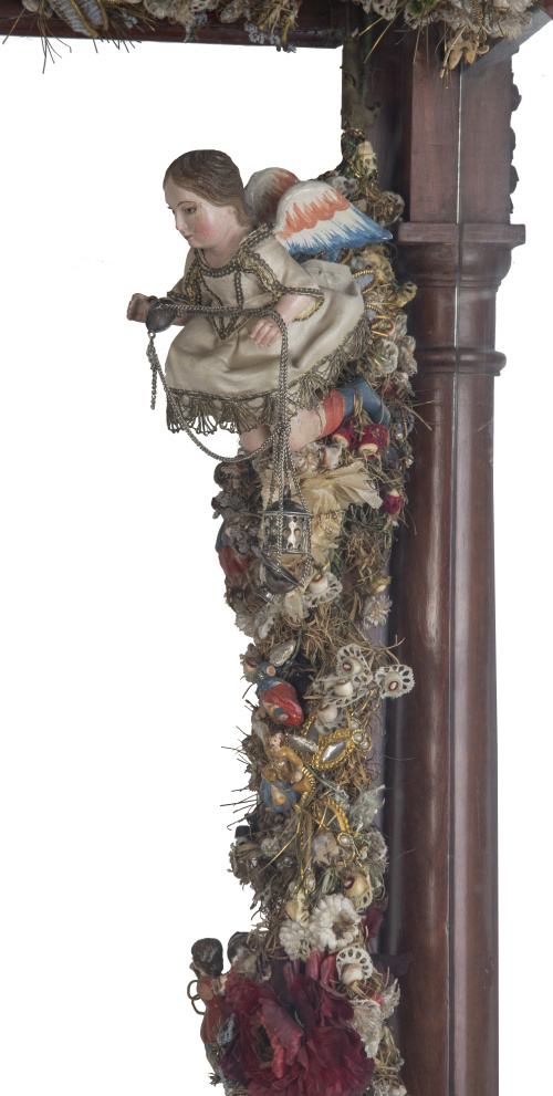 En los laterales guirnaldas de flores de tela y perlas simuladas, rematadas por ángeles de madera tallada y policromada en la parte superior sustentado ambos incesarios de plata.