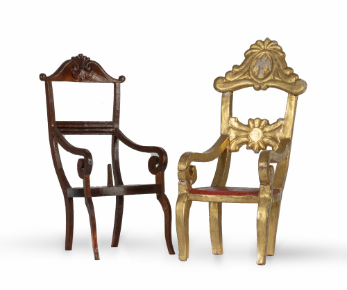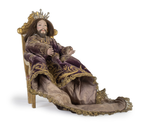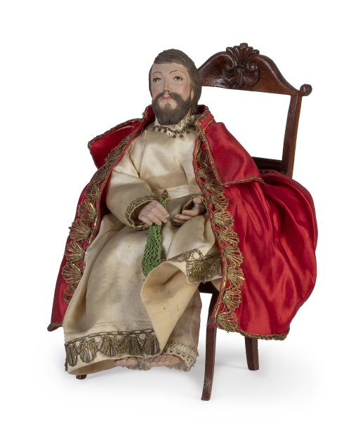 Figuras vestideras de madera policromadas, raso de seda y bordados de aplicación.