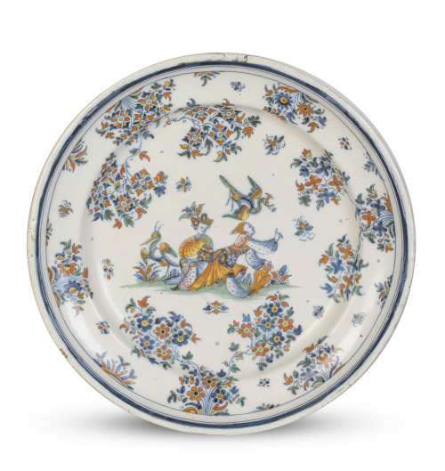 Plato de cerámica esmaltada en azul, ocre, amarillo, verde y azul.