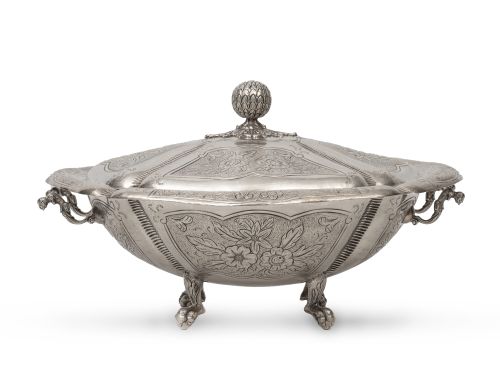 Sopera de plata con tapa con decoración floral. Con marcas
