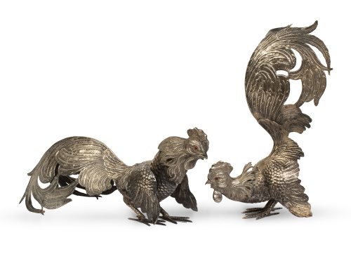 Home / SUBASTA DICIEMBRE 2023 / Pareja de gallos de plata con ojos de cristal rojo. Con mar