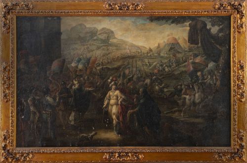 Este cuadro inédito que presentamos es una contribución nueva a la obra de Juan de la Corte o de la Court. De su formación en Flandes no hay datos precisos, pero se le supone relacionado con el taller de Sebastian Vrancx y con su forma de pintar sus historias en amplias perspectivas urbanas. En 1613 declara estar ya avecindado en Madrid. De este año es su vista de la Plaza Mayor de Madrid conservada en el Museo de Historia. Es considerado por Palomino como pintor de países, batallas y perspectivas. Y no debemos olvidar que el propio Juan de la Corte, al solicitar la plaza de Pintor del Rey en 1627 se presenta como profesando en particular arquitecturas, batallas y países. Sus cuadros tuvieron gran aprecio entre sus contemporáneos formando parte de colecciones nobiliarias. Así mismo pintó para el palacio del Buen Retiro de Madrid una serie de temas bíblicos en buena parte desaparecidos.