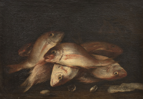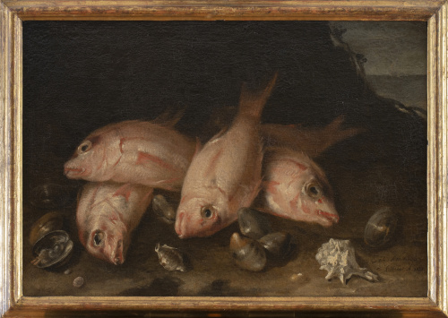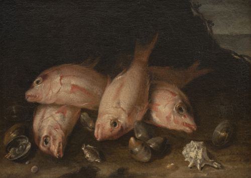 Sobre un fondo de paisaje el pintor presenta un grupo de peces "pajeles" en uno y un conjunto de doradas en otro. Con magníficos toques de colores rosáceos y blancos, una luz uniforme y sutiles efectos lumínicos, moldea con suavidad cada uno de los peces mientras sitúa en un primer plano una sucesión de almejas y conchas que avanzan la composición, añadiéndole un mayor dinamismo. La mirada del espectador se desplaza fluidamente de un elemento a otro, sin detenerse, admirando la exquisita elegancia de ambos bodegones que presentamos y destacando la excelencia pictórica del pintor.