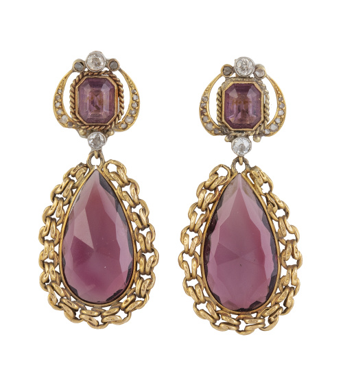 13. Pendientes largos de pp. S. XX con amatistas de talla pera enmarcadas en cadeneta de oro, colgantes de amatista entre brillantes y arcos de dimamantes