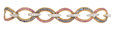 175. Brazalete años 50 de rubíes, zafiros y brillantes con diseño de cadeneta