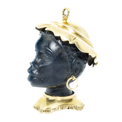 182. Colgante con cabeza de recolectora con cuello y sombrero en oro