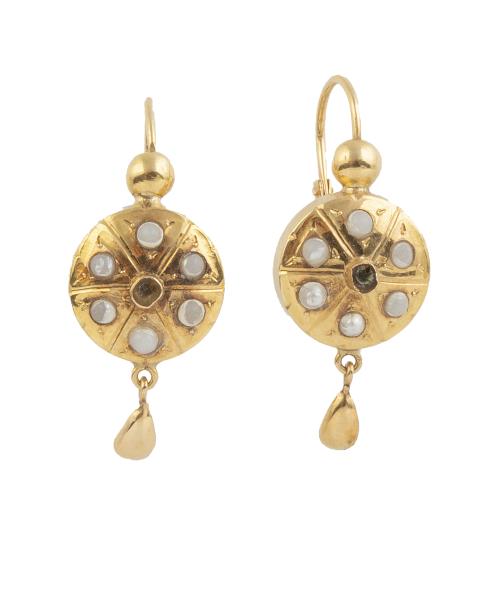 Home / SUBASTA DE MARZO 2024 / Pendientes con rosetones de perlas de vidrio y gota colgante