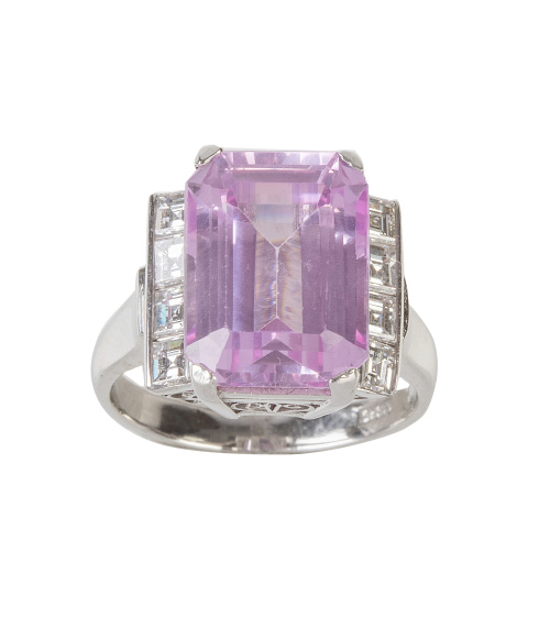 Sortija con rosa de Francia talla esmeralda central entre dos bandas con cuatro diamantes talla carré