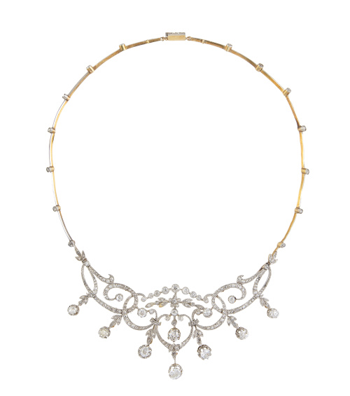 382. Collar gargantilla de brillantes de talla antigua Belle-Époque, con centro de guirnaldas, cintas entrelazadas de diamantes y brillantes colgantes