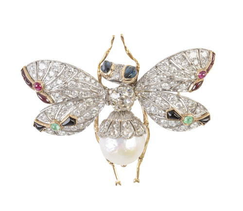 Broche abejorro estilo Art-Decó, con cuerpo de gran brillante de talla antigua, y gran perla, y alas de brillantes, esmeraldas, zafiros, ónix y rubíes