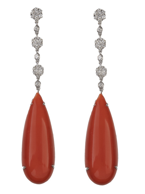 386. Pendientes largos con grandes perillas de coral colgantes de rosetas de brillantes articuladas