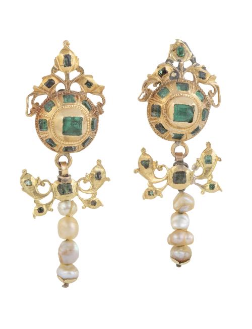 4. Pendientes largos populares S. XVIII con rosetón de esmeraldas del que pende lazo de esmeraldas y línea de perlas de aljófar colgante