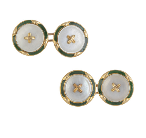 Gemelos dobles franceses de pp. S. XX con doble botón de nácar enmarcados con esmalte verde