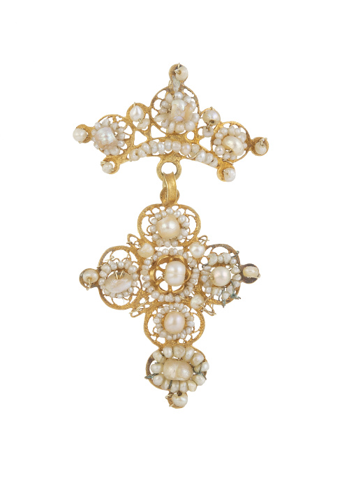 5. Colgante S. XIX compuesto por motivo de corona y cruz colgante realizado con perlas finas sobre filigrana de oro