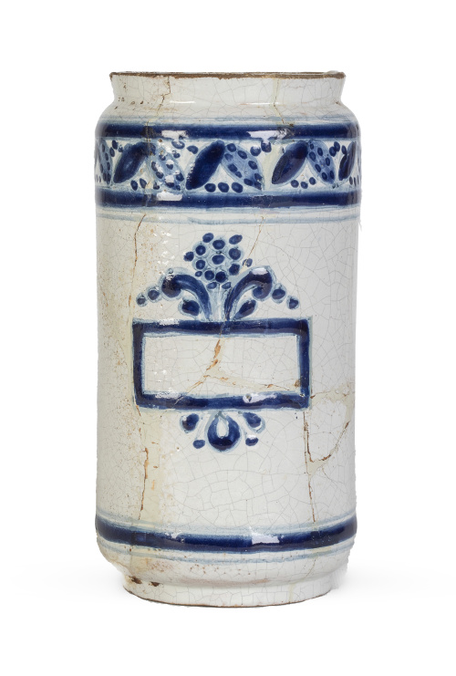 691. Bote de farmacia de cerámica esmaltada en azul y blanco con cartela.