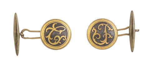 Gemelos circulares de pp. S. XX con trabajo de damasquinado con iniciales "C" y "J"