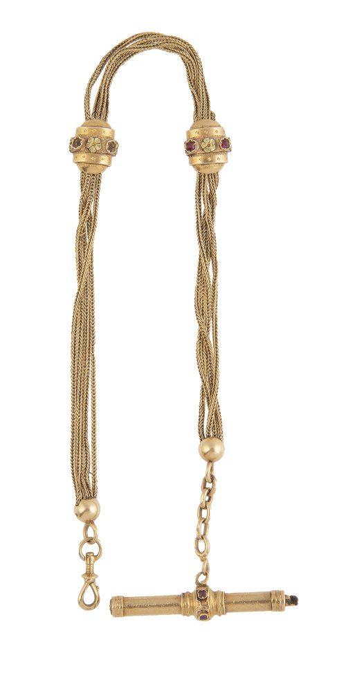 Leontina francesa Napoleón III S. XIX, realizada con cuatro cordones trenzados unidos por pasadores decorados con flores y rubíes