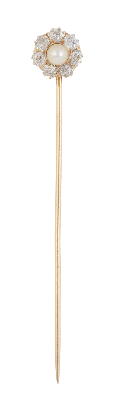 9. Broche alfiler con rosetón de brillantes de talla antigua y perla central