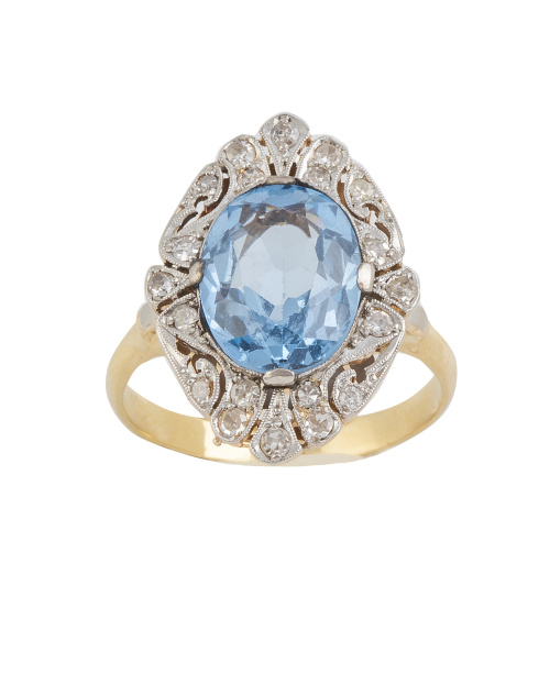 Sortija Art-Decó con espinela azul sintética central en marco calado de brillantes