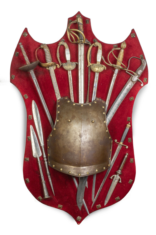 Home / SUBASTA DE MARZO 2024 / Panoplia con parte de armadura, ocho espadas, dos puntas de