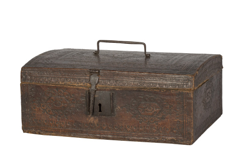 Caja de piel grabada con alma de madera y asa en la tapa.