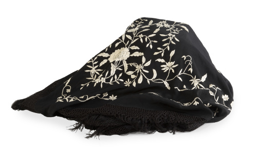 Mantón de "Manila" en seda negra bordada en hilo blanco con flores.