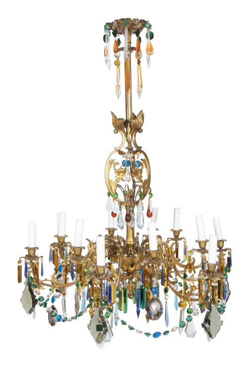1335. Lámpara de techo de doce brazos de luz de bronce dorado y cristal transparente y de colores.